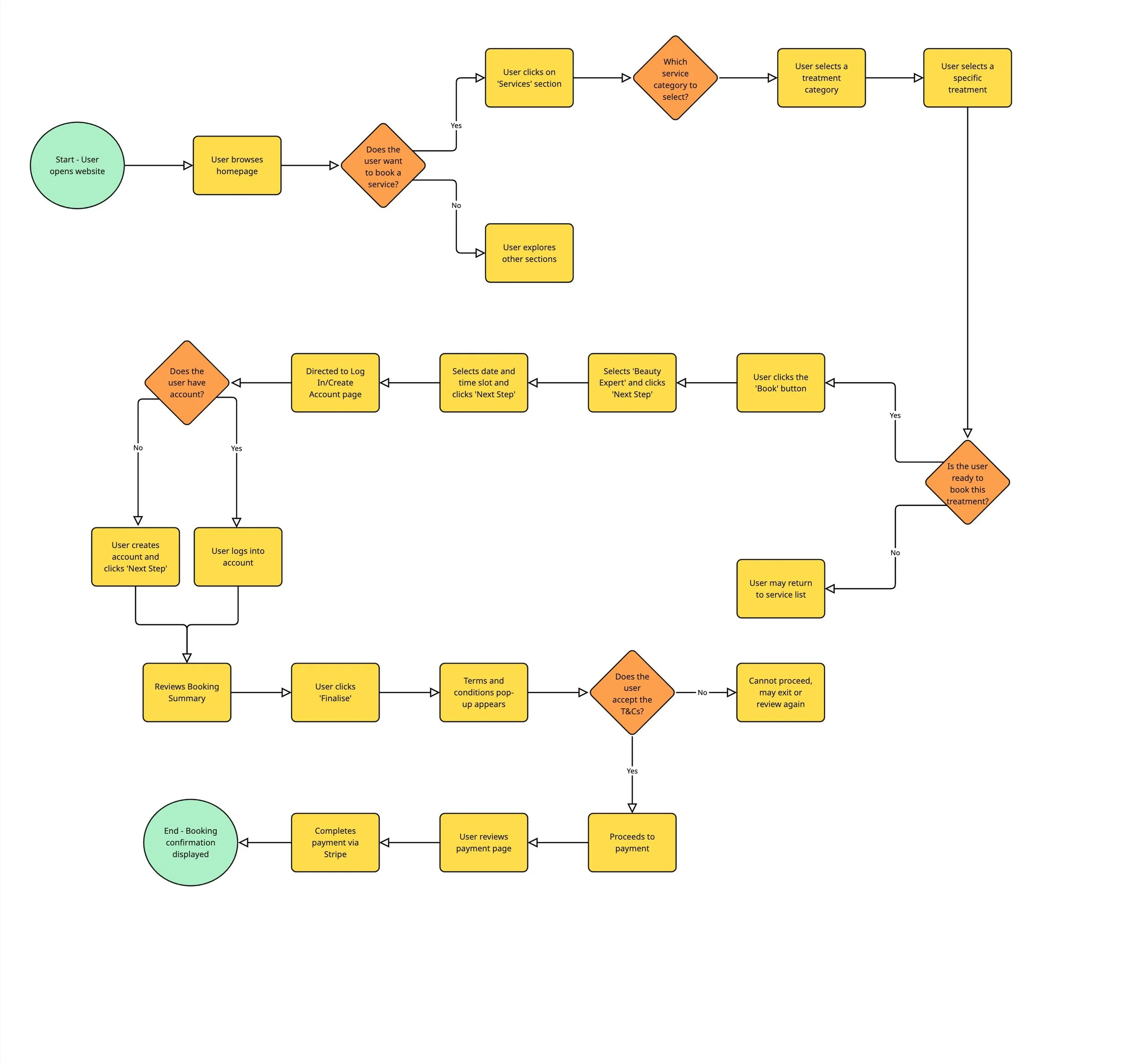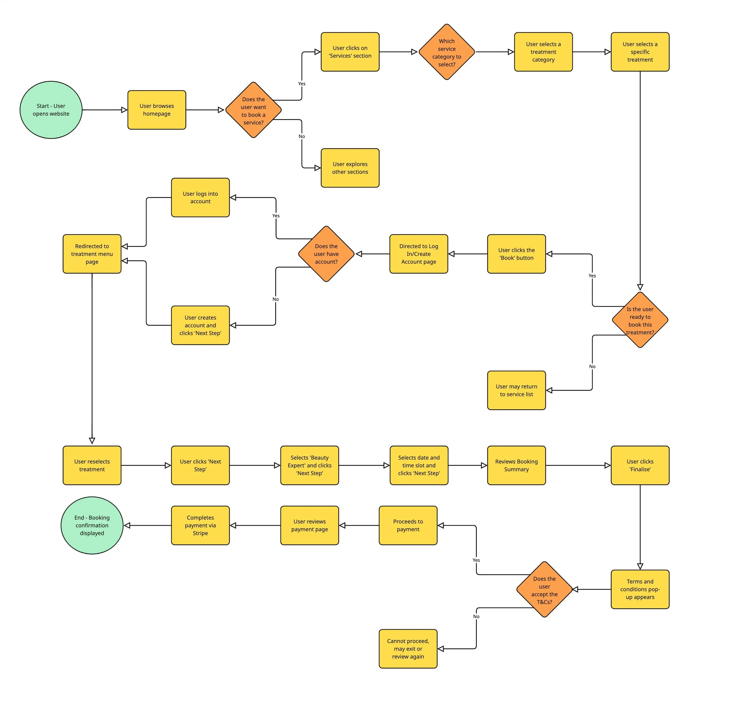 I then created an updated user flowchart. It highlights how removing a few key obstacles can make the user journey faster and more effective. Specifically I removed the prompt for users to log in or create an account before browsing services and also ensuring users don't have to reselect a treatment after logging in or creating an account. Instead, users would only be asked to log in or create an account at the final step before completing their booking and without needing to reselect their treatment. The updated flow now provides a seamless booking experience, reducing friction for users.