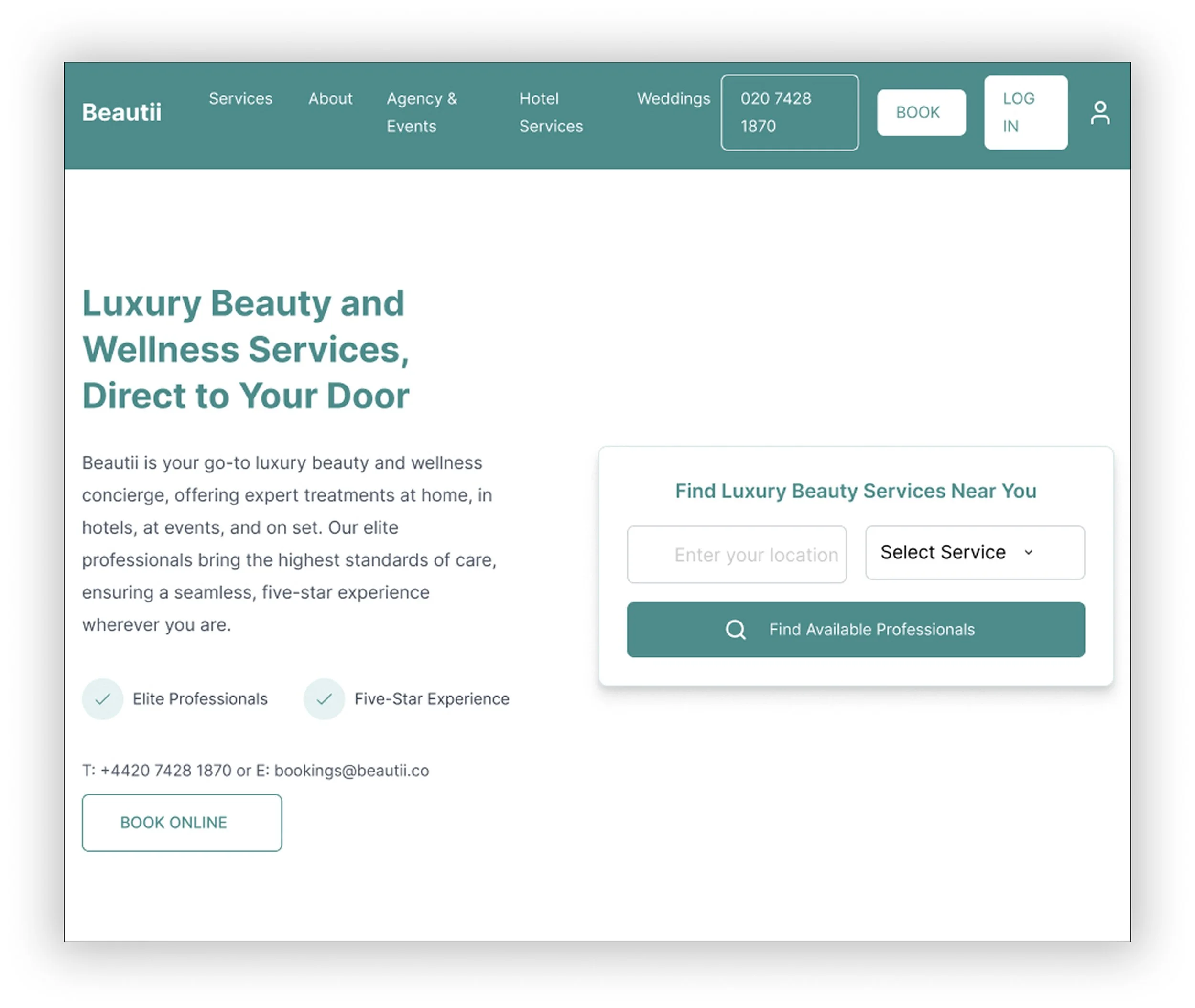 Originally, the homepage highlighted three specific at-home services — Nails, Hair, and Spray Tans. However, this caused confusion around the full scope of Beautii’s offerings. To clarify the brand’s positioning and better communicate its range, we restructured this section to showcase Beautii’s three core service areas instead: At-Home Appointments, Hotel & Spa Services, and Agency & Events.